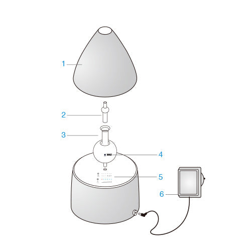 ④Aromax 本体に DC コネクターを差し込み、最後にコンセントにプラグ(6)を差し込みます。